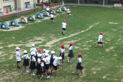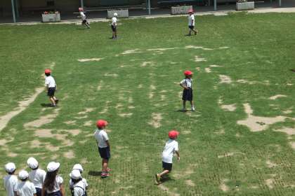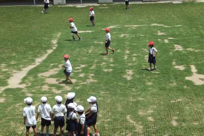 気温がうなぎ上りに上昇した4時限目の終わりの10分、赤白帽で組み分けした子どもたちが中運動場を走り回りました。