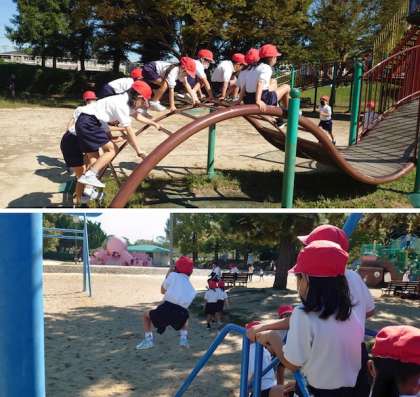 今日は特に「早く遊びたい!」という思いに溢れており、公園に着いて遊びの時間になると、すぐ目の前の遊具に走りかける1年生。奥にも楽しい遊具があることに気付いていない様子で目の前の遊具に夢中でした。