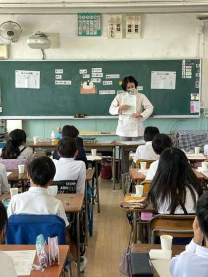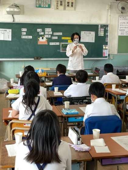 14日(金)の2時間目に、4年生の各教室で、フッ化物塗布と歯についての学習を行いました。