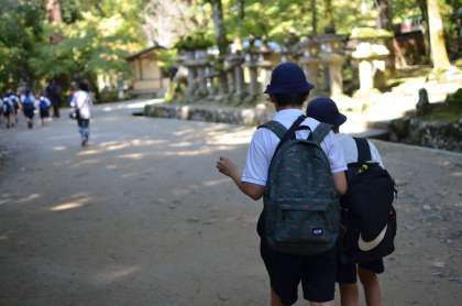 奈良駅に着いて、早速鹿のお出迎え。沢山の鹿に驚いていました。奈良公園に着いてオリエンテーリングをし、各班が協力しながらゴールに向かいました。