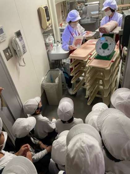 バックヤードでは、切り身になる前の魚を見せてもらい、出世魚のお話をしてくださったり、肉のブロックを見せてもらったりしました。魚や肉が切られている前の物を見て、「大きい!!」と声が上がっていました。また大きな冷蔵庫に入らせてもらい、「一瞬で寒くなった。」と中々普段入ることのできない発見が沢山見つかりました。