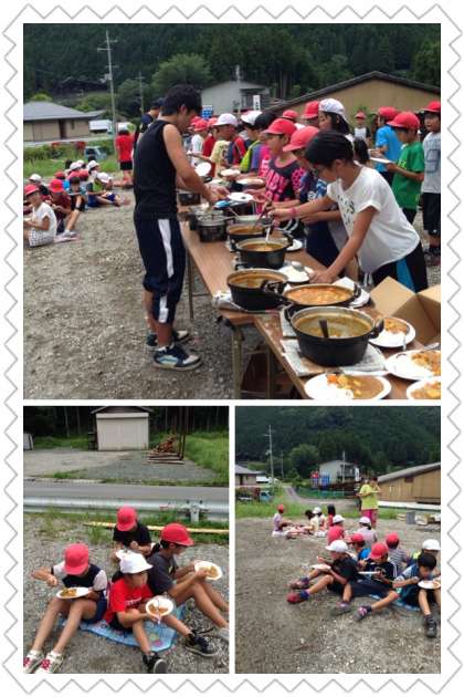 やっとのことでカレーができあがりました。しっかり火を起せた班は美味しくできたようです。他の班と味を比べながら、美味しくいただきました!!
