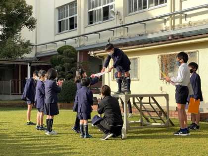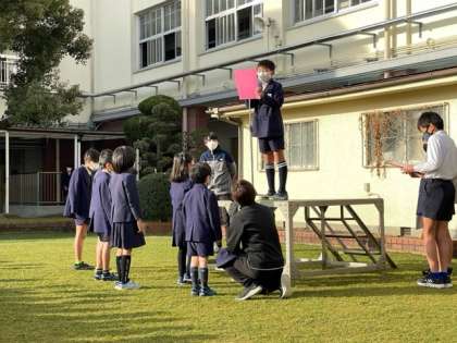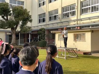 6日(月)、児童朝会を中運動場で行いました。