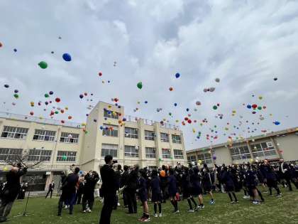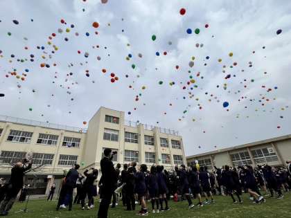 卒業生の風船にはメッセージ付きの風船が色鮮やかに舞い上がり、今年の卒業式を無事に終えることができました。