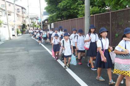 子どもたちは、夏休みの宿題を抱えて登校してきました。夏休みで疲れているのか、「おはようございます」の声に元気がありません。でも、友だちを見つけると、パッと顔が明るくなり、お話を始めていました!!