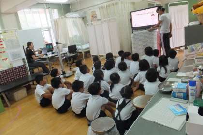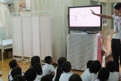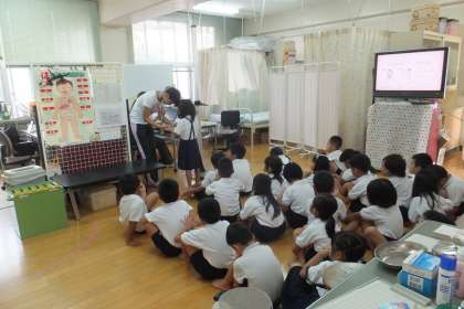 最初に保健室の先生から、ケガについてのお話を聞き、身長と体重を測定します。夏休みの間に、どれだけ成長したかな??