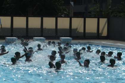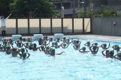 プールの中では、先生の号令に合わせて、腕を動かしたり、水中に潜ったりしていました。