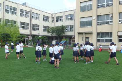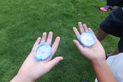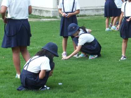 「この時間、月はどっちの空にで出いるか」を調べるために、方位磁針を持って中運動場に出てきました。方位磁針を使って、東西南北を確認し、月を探しましたが、残念ながら見つけることができませんでした。