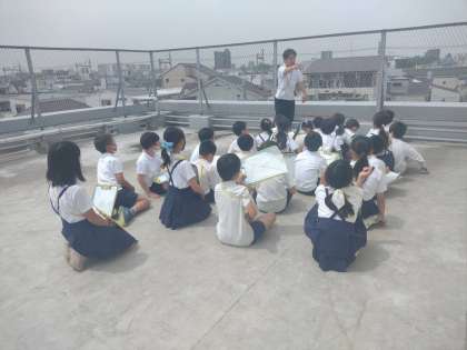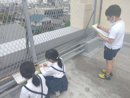 3年生では、社会科の授業で校舎の屋上に行きました。学校を中心に東西南北それぞれの方位には何があるのか調べ、屋上から見える物をワークシートに書いていました。屋上からの眺めに興奮気味の子どもたちでした。
