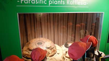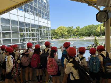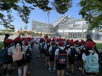 咲くやこの花館への入場前は、担任の先生の指示を聞きながら期待に胸を膨らませている様子の子ども達。館内では世界最大の花「ラフレシア」を見て驚いていました。退館後も池の噴水に興味津々の様子で、何かを見つける度に友達に知らせてみんなで楽しむことができました。