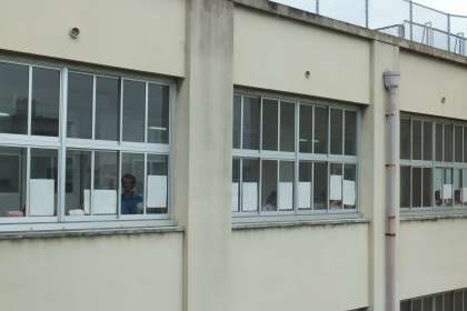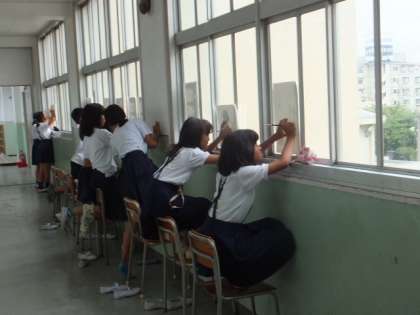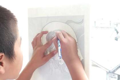 窓に紙をあて、何をしているのかな?近づいてよく見ると、浮世絵のコピーを窓にあて、その上から白い紙をあわせて、その絵を裏側から写していました。
