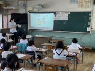 15日(月)5時間目、1年2組では栄養教諭の今西先生から栄養指導を受けました。