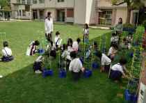 中運動場のふかふかの芝生の上で、ミニトマトの苗の観察を行いました。