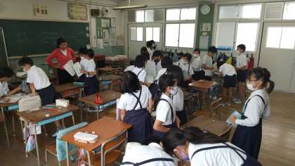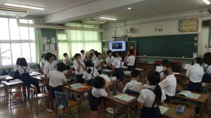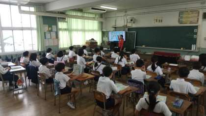 30日(火)交通安全教室を実施する予定でしたが、雨天のため延期となり、4年1組で外国語学習を実施しました。
