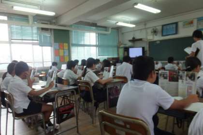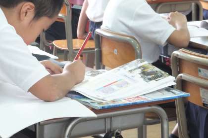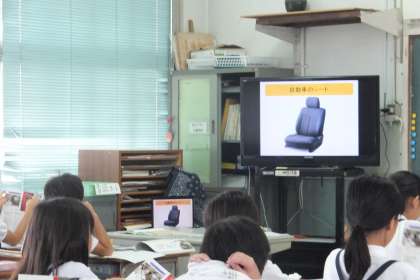 子どもたちは、まず、教科書を音読し、課題を見つけ、テレビモニターに提示された資料等をもとに考えます。意見を出し合い、さらに教科書を読んで確かめ、大切なところに赤鉛筆で線を引いていました。