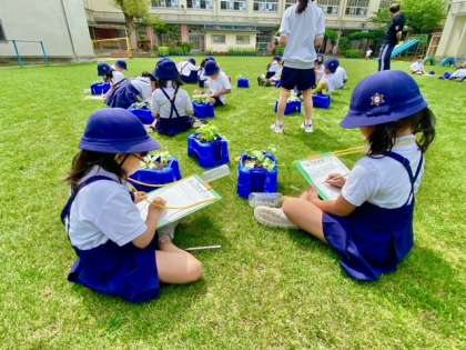 朝顔の観察を行いました。茎が長く伸びていたり、葉っぱの枚数が増えたりしていたようです。
