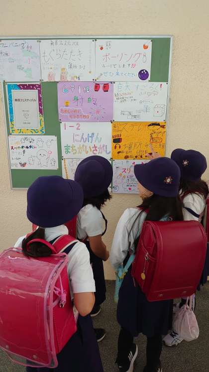 各学級のお店を宣伝するポスターが完成し、職員室前の掲示板に一覧が貼られました。今週は、登校してきた児童がポスターの前で人だかりをつくっています。