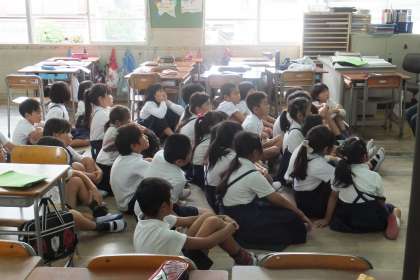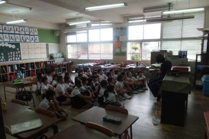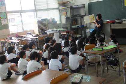 先生が絵本の読み聞かせをしていました。教室の椅子と机を移動させ、先生は椅子に、子どもたちはフロアに座り、絵本の読み聞かせの雰囲気も高まりました。