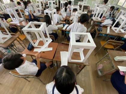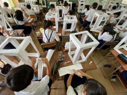 図画工作科で「ビー玉コース」を作っています。今は全員が土台を完成させたところで、これからそれぞれアイデアを生かしたコースを組み立てていきます。