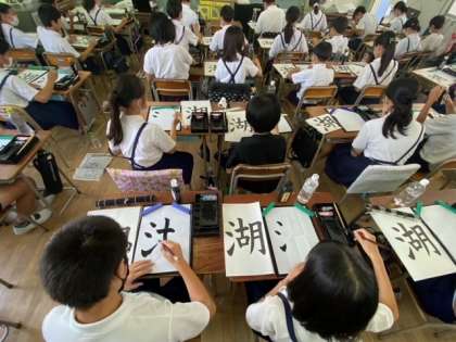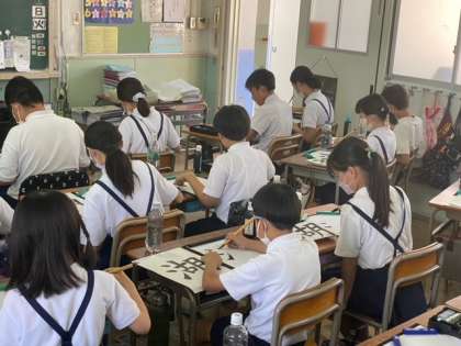 昨日、6年生の学級(2組)で習字の学習をしている様子をお伝えしましたが、今日はお隣のクラス(1組)で習字学習を行っていました。