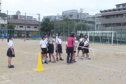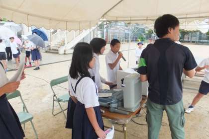 体育館では運動会のスローガンの掲げたボードづくり、東運動場では、雨の止み間に決勝・審判、放送係が練習していました。その他教室でもラジオ体操の手本の練習や用具の準備についての打ち合わせなどいろいろな活動が行われていました。