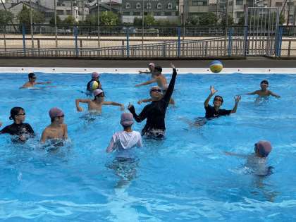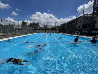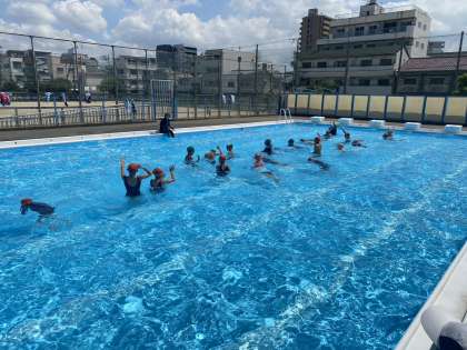 5年生が林間学習に出かけましたが、学校では今日も夏季水泳指導に取り組んでいます。