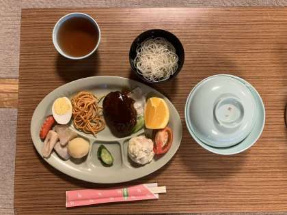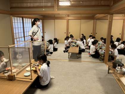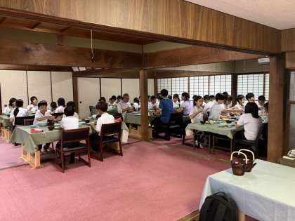 クラス別に新館と旧館に分かれて、学級の仲間との食事風景です。たくさん歩いた後の食事は一段とおいしく感じるかな?