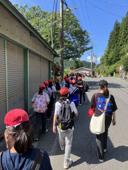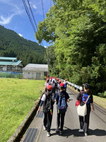 宿舎を出発し、川遊びや魚つかみ、飯盒炊爨をする川原までウォーキングのスタートです。
