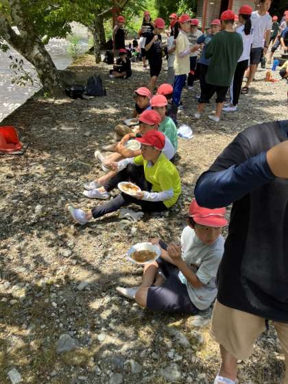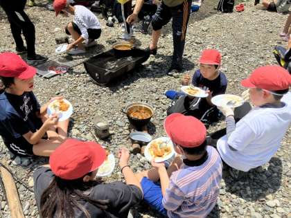 カレーが出来上がり、班ごとに昼食タイムをとっています。