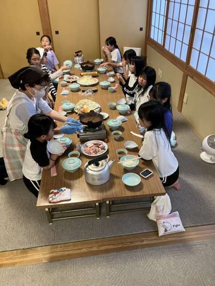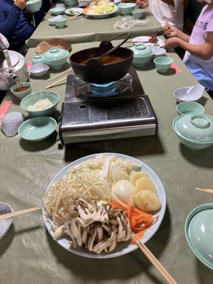 子ども達はとても元気です。旅館名物の「まえひら鍋」を夕食に頂きました。コロナ禍では鍋を頂くことはできなかったのですが、4年ぶりの復活鍋となりました。