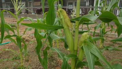 東運動場の東側に畑があります。管理作業員さんがきれいにうねを作ってくださり、野菜を育てていますが、「とうもろこし」と「きゅうり」が順調に育っています。