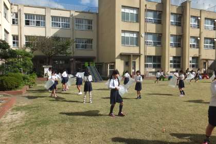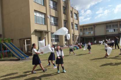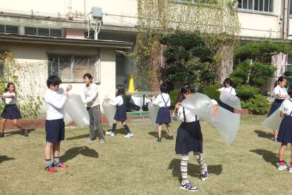 秋の空気が爽やかな中運動場で、大きな袋を持って走り回っています。何をしているのかなと思って聞いてみると、「その大きな袋に空気をとじこめている」という答えが返ってきました。子どもたちは、袋の口を閉め風船のようにして遊びだしました。