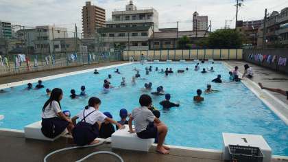 週末にプール納めの予定ですが、天候が悪ければ最後になる水泳学習。5年生が、笑顔いっぱいでプールに入っている様子が見られました。