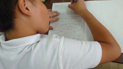 1組では、いろいろな図形が描かれたプリントを見ながら、内角の大きさや辺の長さについて比べていました。