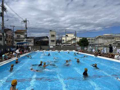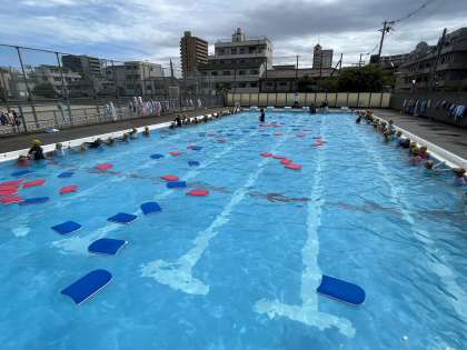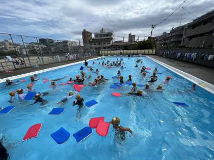 子ども達が大好きな「たからさがし」では、プールの底に沈められた色とりどりのゴムボールをたくさん拾った方が勝ちですが、今日は先生からラッキーアイテムが示され、必死に探す様子が見られました。