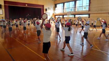 4年生は、沖縄の伝統楽器パーランクーを持って「エイサー」の練習に励んでいます。