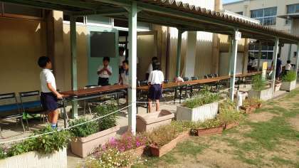 15日(金)、5年生が敬老会の会場準備を行いました。