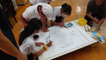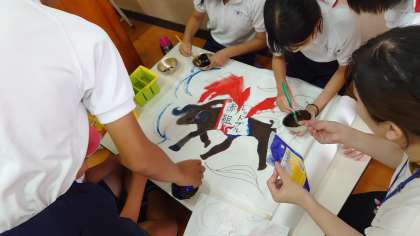 22日(金)20分休みの時間を活用して、応援団が団旗の作成をしています。