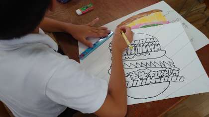 色が入ると、一気にカラフルバーガーに変身します。完成が楽しみです。