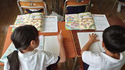 デジタル教科書を活用して課題をみんなで確認していますが、机の上にも全員が同じように教科書を開き確認していました。クラス全体が揃っていて集中している様子が伝わってきます。
