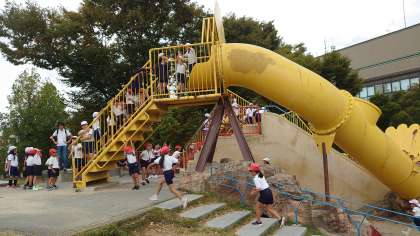 お弁当を食べた後は、大きな滑り台や広い芝生広場で思い切り遊びました。他の学校の子ども達も多かったですが、順番やマナーを守って仲良く遊ぶことができていました。