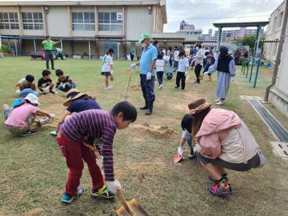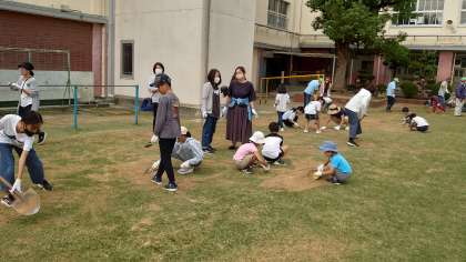 本日は、近隣幼稚園の運動会と日程が重なり、ボランティアの人数が少ないかと懸念しておりましたが、グリーンキーパーズ、PTA役員の方をはじめ本校の保護者、子ども達、卒業生、そして本校から転出した親子の方なども集まってくださり、1時間で作業を終了することができました。