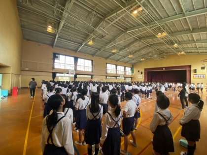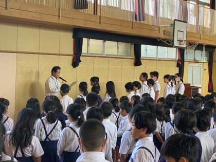 16日(月)児童朝会の様子です。夏休みの科学賞の表彰を行いました。参加賞に加え、4・5・6年生の代表1名にコメント付きの賞状が渡されました。