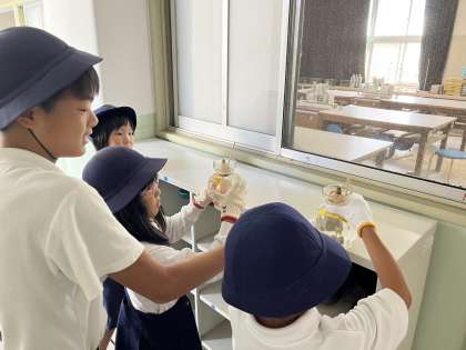 1年生と6年生のペアで活動する光景は、いつも心がほっこりします。普段はやんちゃで元気な6年生も、1年生の前だとしっかりした態度でとっても優しくリードしてくれます。1年生もとっても嬉しそう。