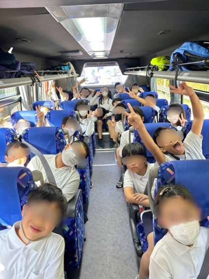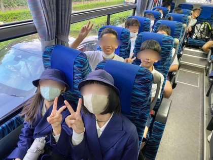 1組さん、2組さん、バスの中でも元気いっぱいです。