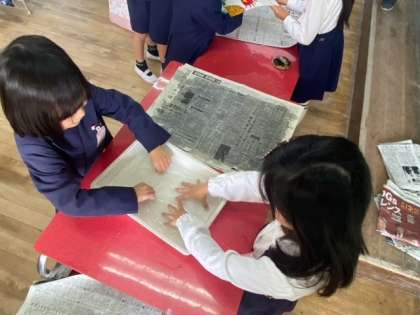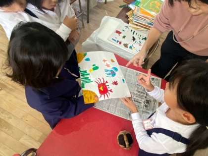 友達と協力しながら、ぎゅっぎゅっと押して、色を重ねていきます。