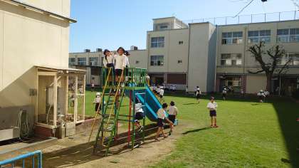 今日は低学年の日。中央付近では3年生、鉄棒付近では2年生、滑り台付近では1年生の集団が自由に遊んでいました。