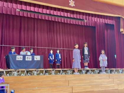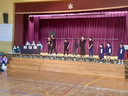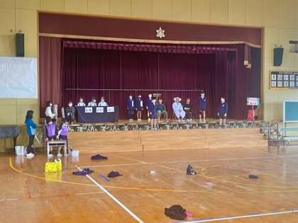 子ども達は楽しみながら稽古に取組んでいます。人前に立つことへの恥ずかしさも芽生えてきた4年生ですが、役になり切って演じてほしいですね。