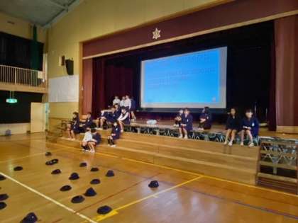 発表の精度をあげるため、本番を想定して練習している5年生です。