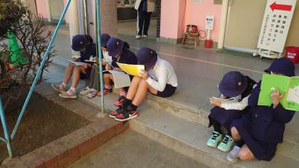 4年2組さんが玄関付近や職員室の近くで黙々と何かを描いていました。